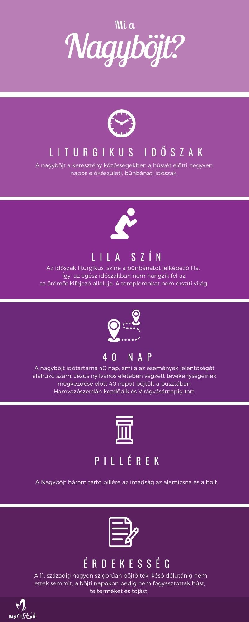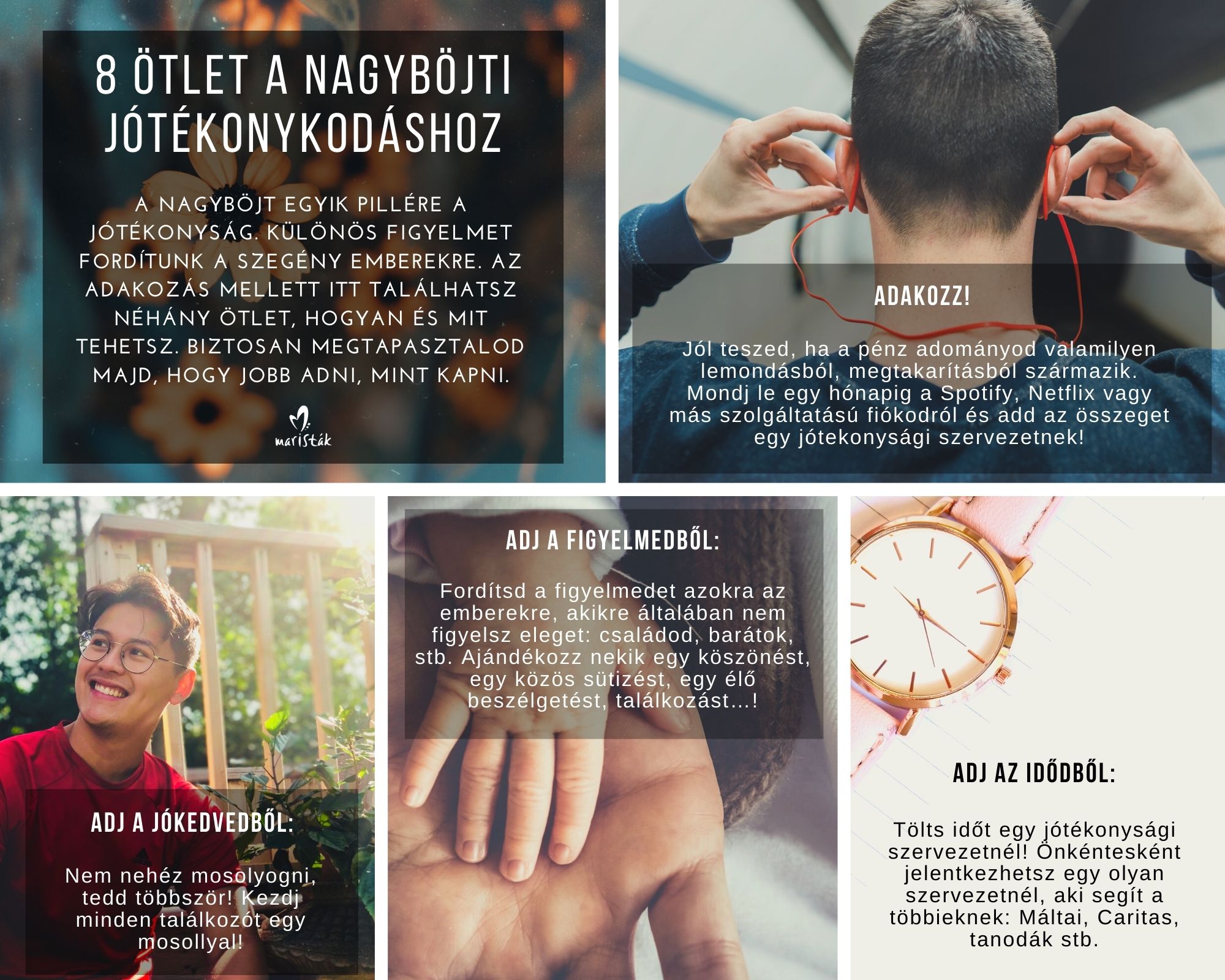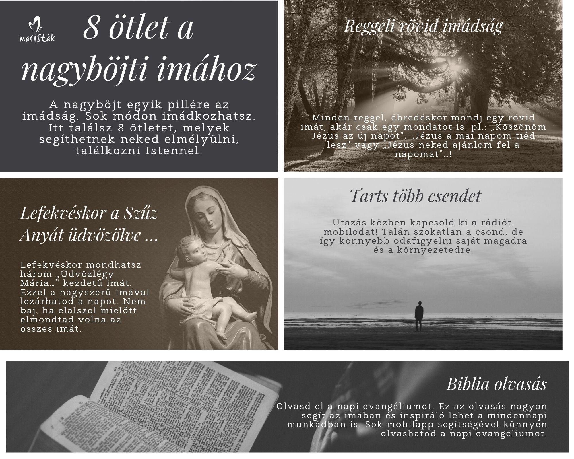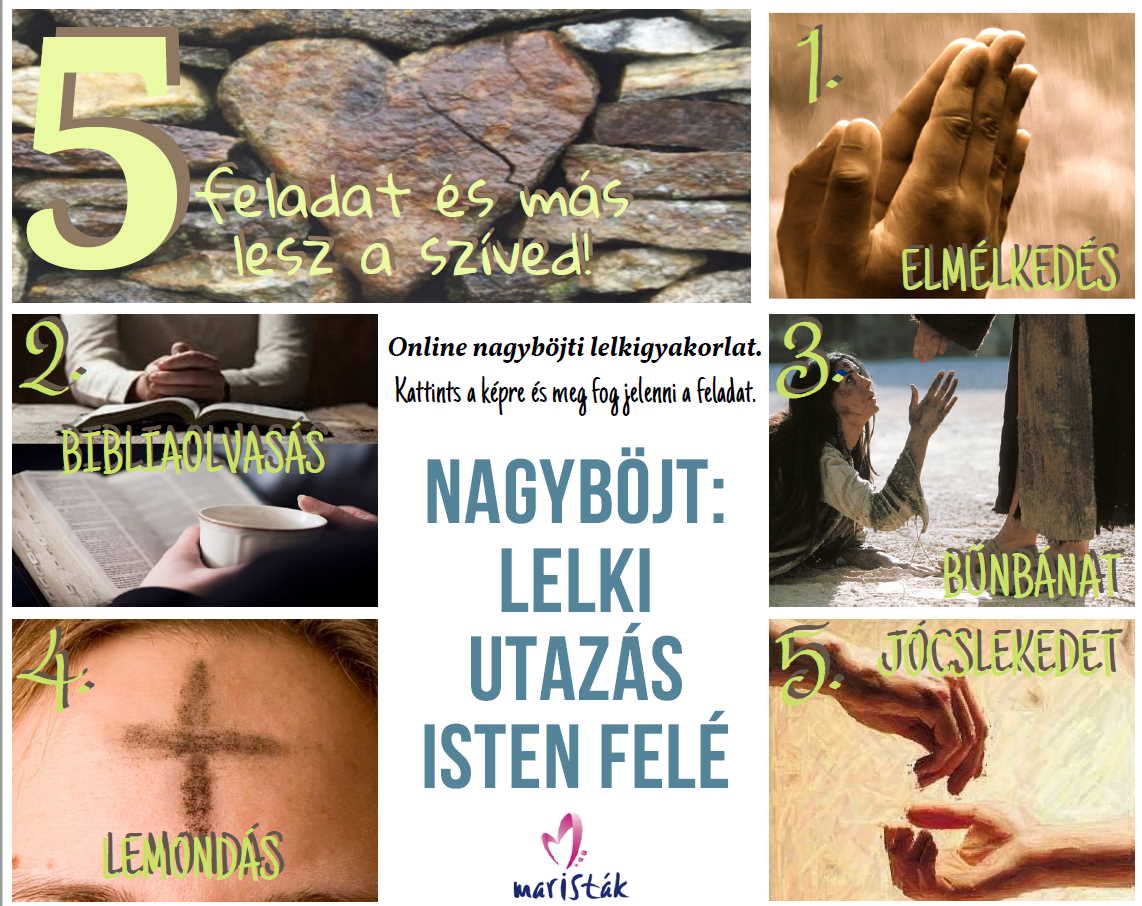 Mi Marista testvérek felajánlunk különböző segédanyagokat, amelyek végig kísérnek a Nagyhéthez vezető úton: ötleteket a nagyböjti imádsághoz, böjtöléshez és alamizsnához, egy on-line lelkigyakorlatot, valamint keresztútakat és más imádságokat is találhatsz benne.
