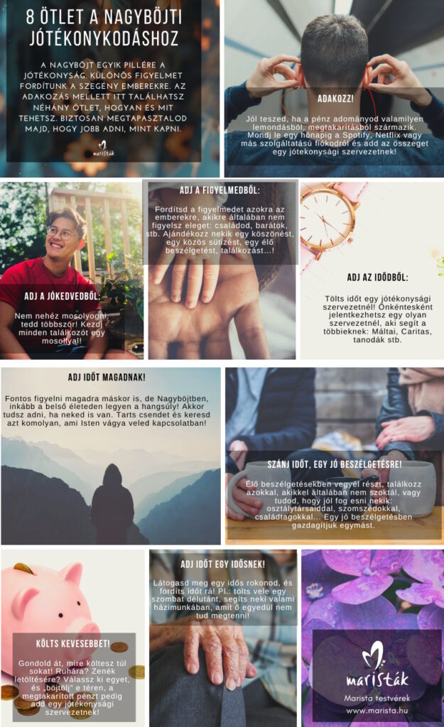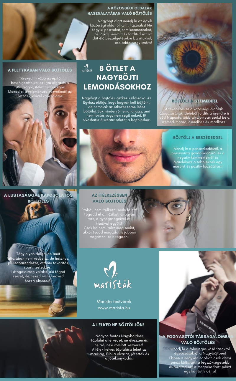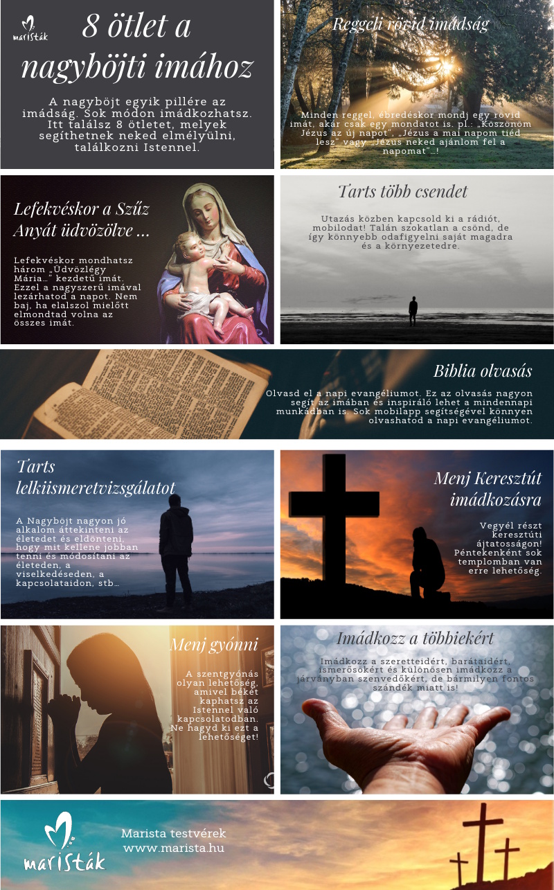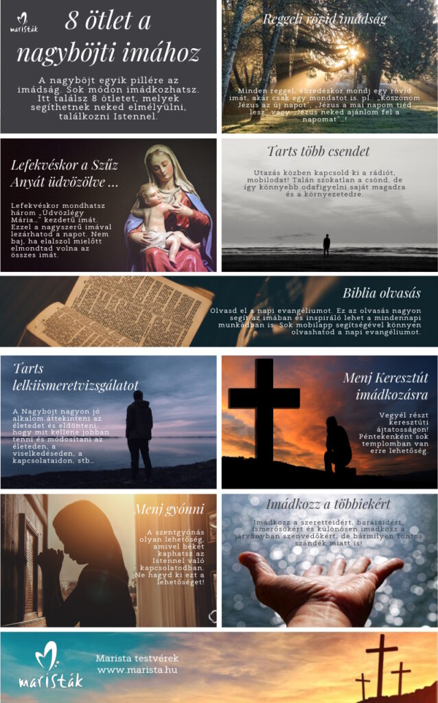 Imádságban mélyíthetjük kapcsolatunkat Istennel. Lemondásainkkal szabaddá válhatunk attól, ami elvonja figyelmünket a lényegről. A jótékony szeretet tetteivel pedig kézzelfoghatóvá tehetjük hitünket a körülöttünk élők számára.
